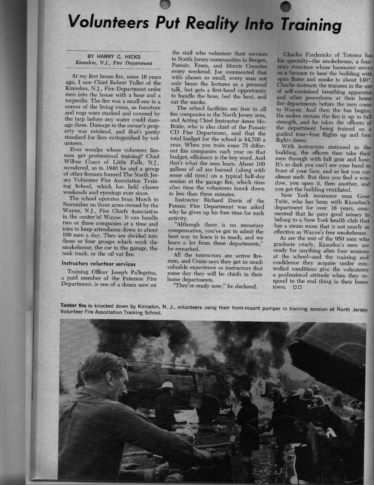 | In 1968, KVFC veteran and Company 3 Captain Harry Hicks wrote a training story which was published in the December '68 edition of the nationally circulated Fire Engineering Magazine. It is reprinted below. The firefighter seen clearly in the left of the photo is Company 1's Elwood "Dutch" Kishbaugh, who would be Chief in 1984-1985. Dutch is operating the 500gpm Hale pump, front mounted on Engine 1, a 1960 H&H Ford. |